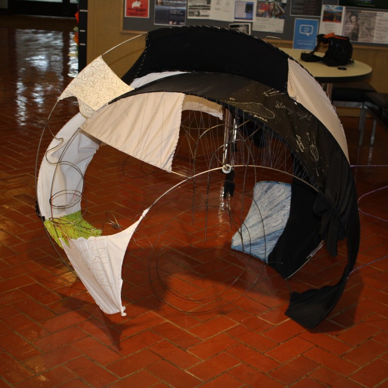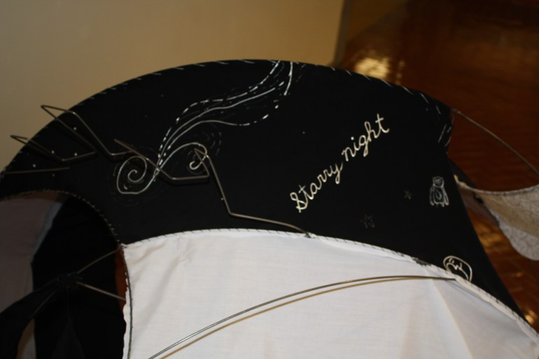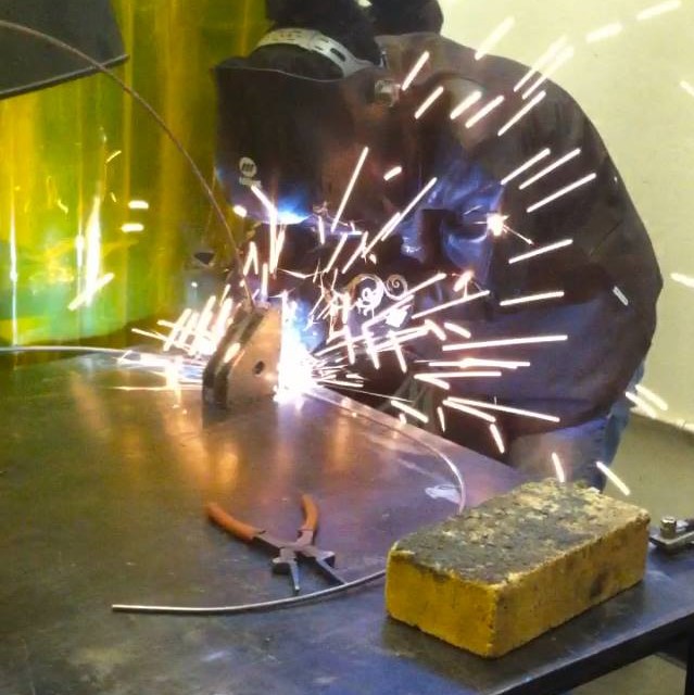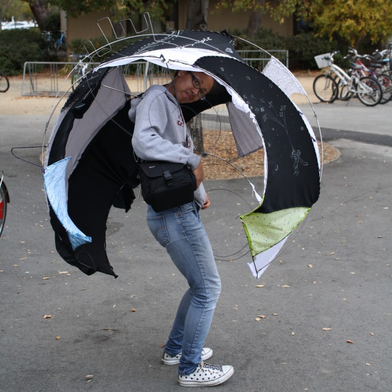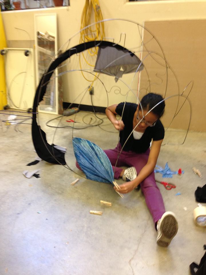 The prompt for this project was to make a wearable sculpture. The above shell with a removable harness was what I came up with. I wanted to explore MIG welding and fabrics, so I designed a frame with bent cold-rolled steel rods. I then sewed on various decorated fabrics.