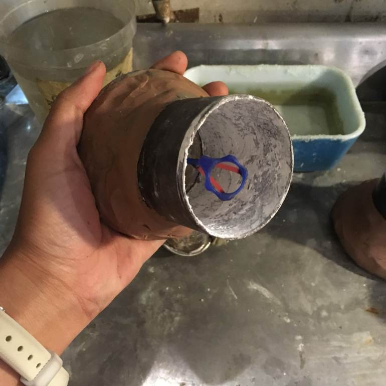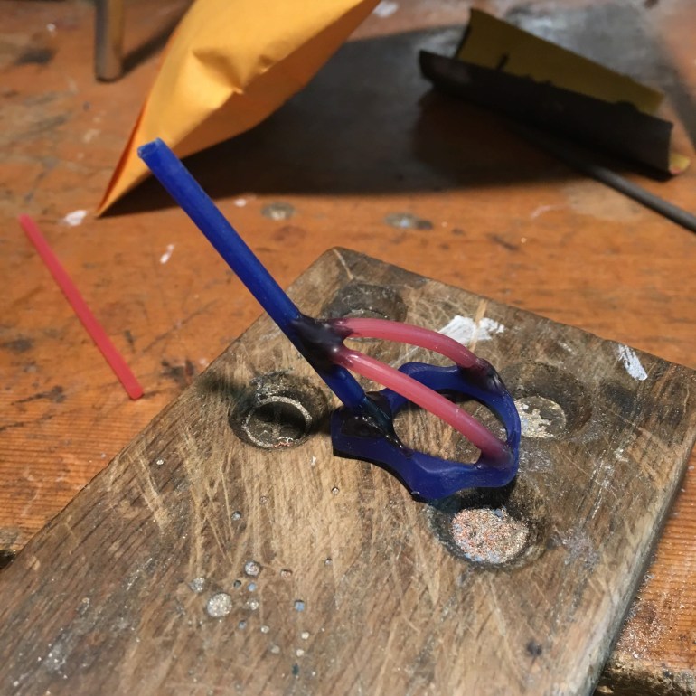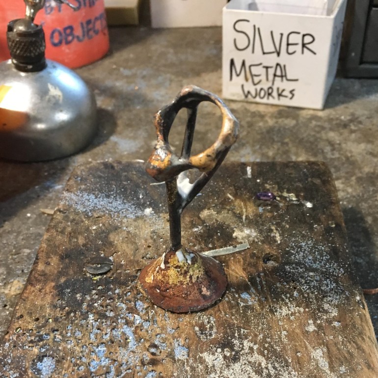 It requires hand carving a piece out of wax then setting it in plaster. Next, fire the flask of plaster to melt out the wax. You’re left with a negative of your piece in a mold. Finally, cast a molten metal of your choice in the mold.