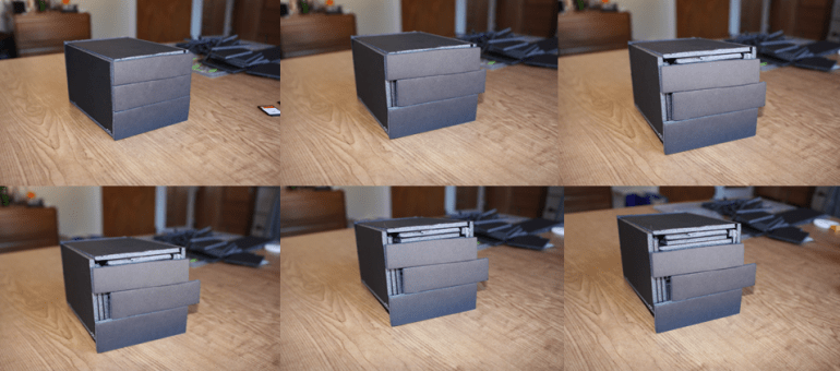 The moving face is constrained by the slots and walls of the box, but is still able to move freely along the path of the maze. What results is a box you can only open if you move the face or sliding piece in the right directions. When you solve the puzzle, you can slide off the lid.